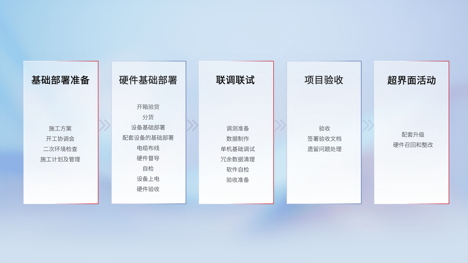 从基础部署准备、、、硬件基础部署、、、、联调联试、、、、项目验收、、、、越界面活动的全过程可追溯,,,保证施工质量和进度。。。